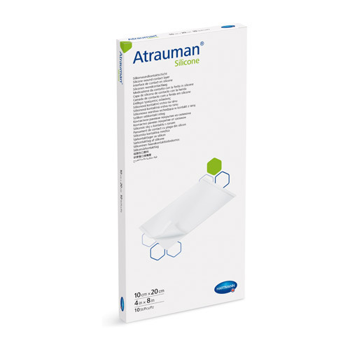 Hoogste bescherming voor gevoelige structuren - ook bij negatieve druktherapie. (NDT) Atrauman® Silicone is een wondcontactlaag, bestaande uit een polyethyleenterephthalaat (PET)-net als dragermateriaal, dat met siliconengel (gebaseerd op polydimethylsiloxan) aan beide zijden bekleed is. Deze wondcontactlaag dient als atraumatische wondbehandeling en is dun, zacht, op maat te maken en drapeerbaar. Door de open netstructuur is het exsudaatdoorlatend. Het hecht zacht en zeker op droge, maar niet op vochtige, oppervlakken. Daarmee voorkomt het verkleving met de wond. Atrauman® Silicone is een wondcontactlaag, die voor een atraumatische behandeling van oppervlakkige, acute en chronische, licht tot matig exsuderende wonden ingezet wordt. Gebruikt als beschermlaag op niet exsuderende wonden en op plaatsen met gevoelige huid. Kan ingezet worden bij negatieve druktherapie (NDT), in het bijzonder bij organen en andere gevoelige structuren.