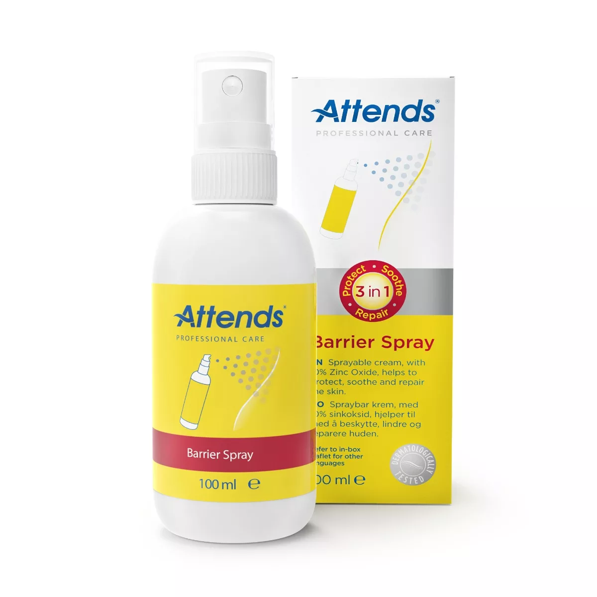 Attends Barrier Spray is een spraybare crème voor huidbescherming die helpt om de huid te kalmeren, te verzachten en te herstellen tegen incontinentiegeassocieerde dermatitis bij volwassenen.