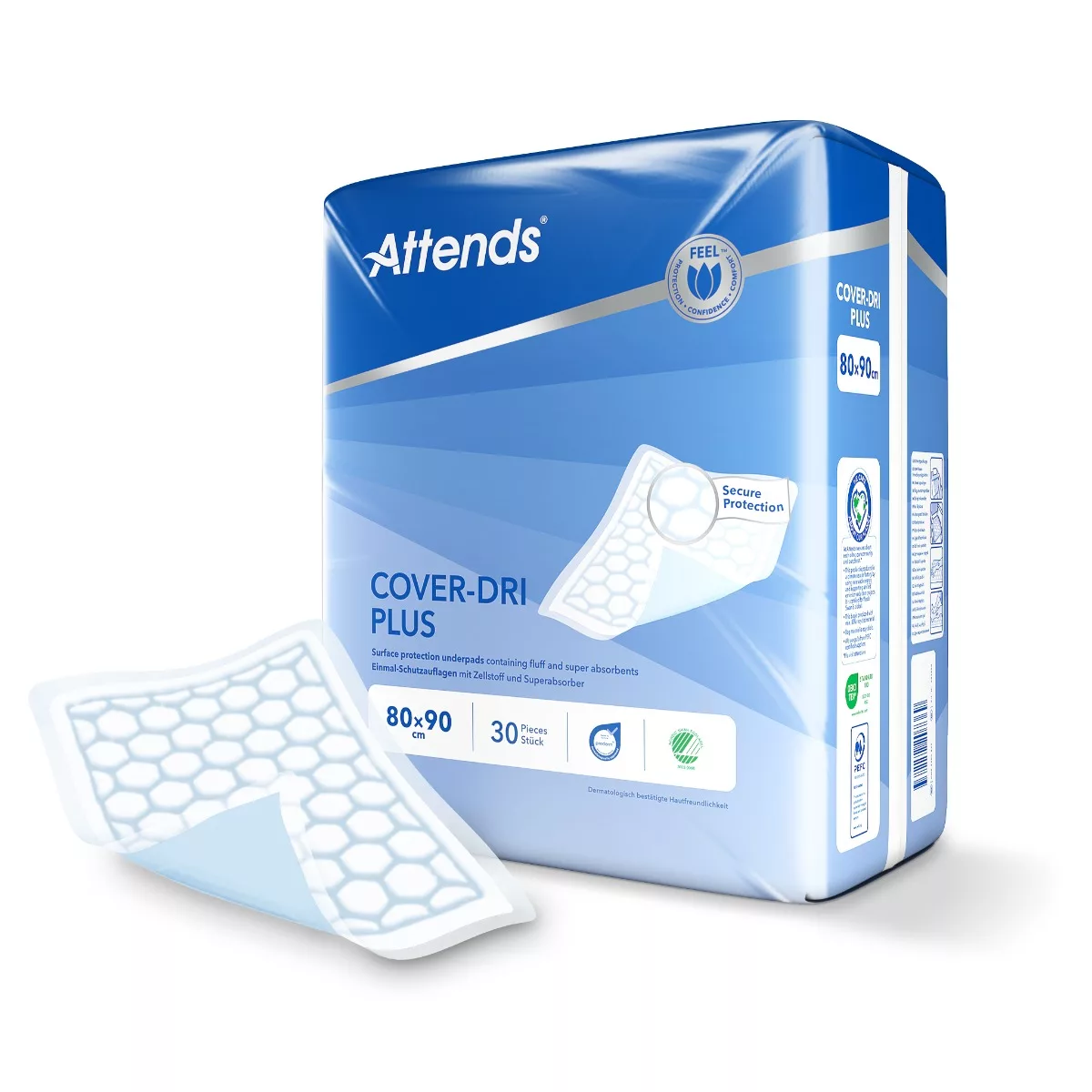 Attends Cover-Dri Plus zijn oppervlakte beschermende onderleggers, speciaal ontworpen voor lichte tot matige urine-incontinentie. Cover-Dri heeft een patroon van zeshoekige kussentjes, die fluff en superabsorberende bestanddelen bevatten. Vocht wordt hierdoor snel geabsorbeerd en ingesloten. De tussenliggende kanalen verdelen het vocht snel, zonder dat het zich op één plaats ophoopt. De anti-lekrand rondom het product helpt lekkage te voorkomen. Een lichtblauwe waterdichte onderkant zorgt ervoor dat de onderlegger op zijn plaats blijft.