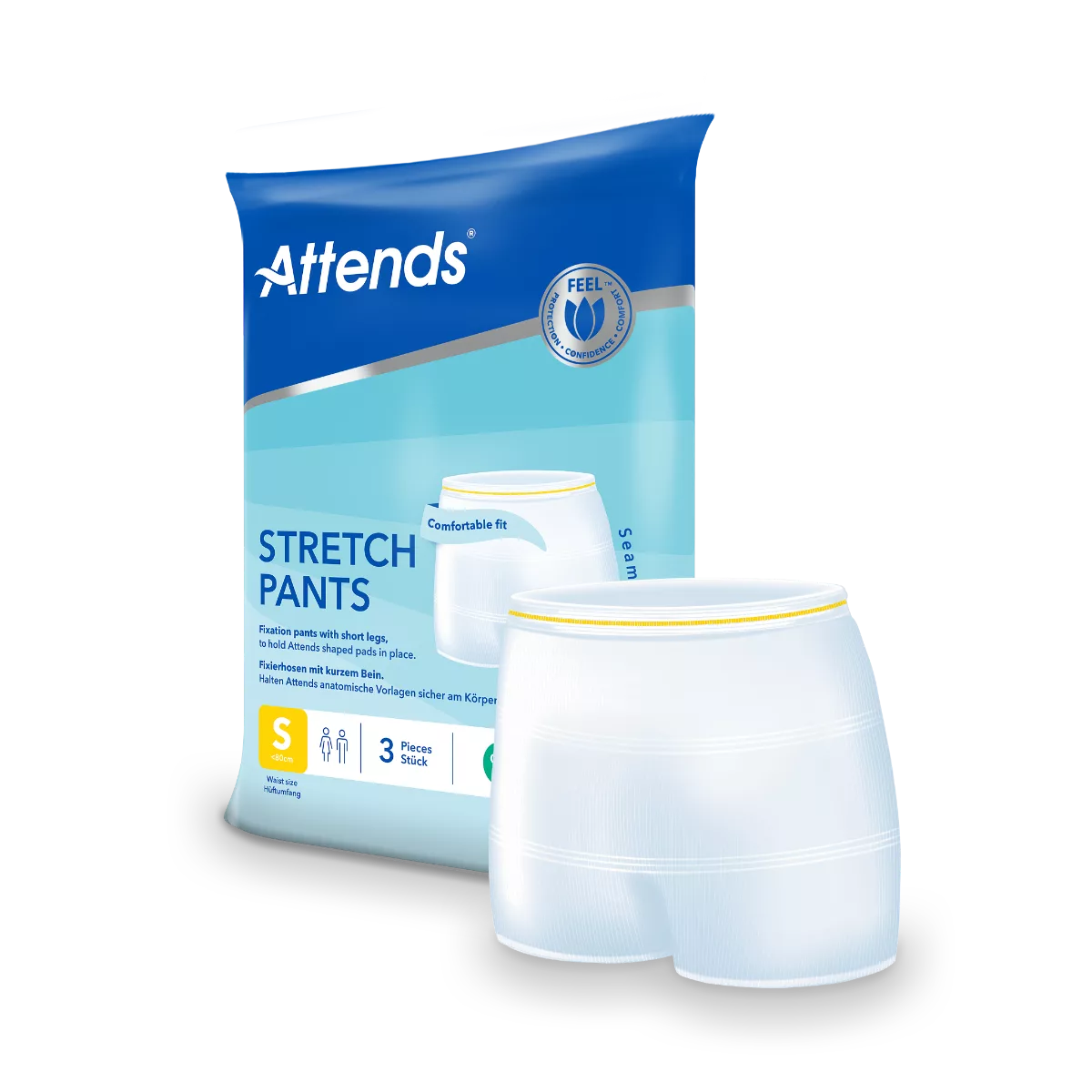 Attends biedt een reeks fixatiebroekjes met korte pijpjes speciaal ontworpen om te gebruiken in combinatie met Attends inleggers. Het is belangrijk om de juiste maat te kiezen: meet uw heup- en middelomvang en neem de grootste maat als uitgangspunt. Attends Stretch Pants is gemaakt van een zacht wit stretchmateriaal en heeft korte pijpjes wat zorgen voor een comfortabele en een zeer goede pasvorm. De broekjes bieden een gevoel van zekerheid en zorgen ervoor dat de inlegger perfect aansluit op het lichaam. Ze worden gedragen als normaal ondergoed en voelen ook zo aan. Kunnen tot 25 keer gewassen worden.