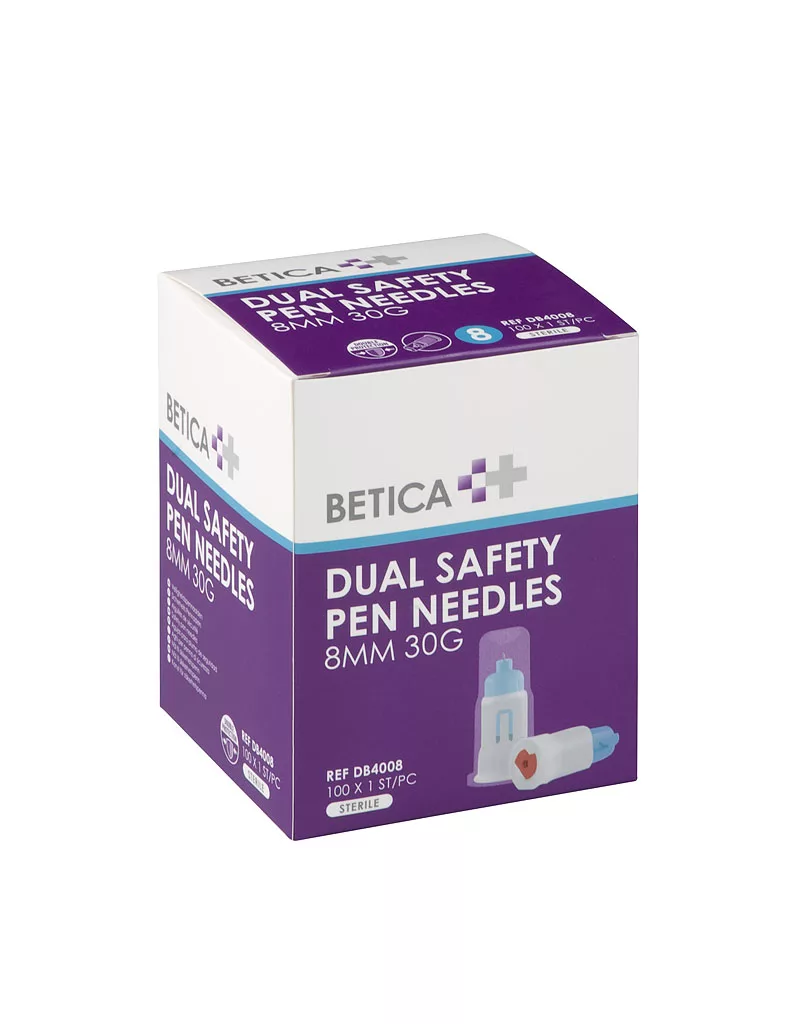 Met de Betica veiligheidspennaalden is de zorgprofessional optimaal beschermd tegen prikaccidenten. Betica veiligheidspennaalden zijn voorzien van een dubbele beveiliging. Hiermee worden prikaccidenten voorkomen, doordat na de injectie een cover automatisch de naald aan de cliënt- en de penzijde bedekt. Meer injectiecomfort door het soepel activerende veiligheidsmechanisme. Betica veiligheidspennaalden zijn de enige veiligheidspennaalden waarmee injectie onder een schuine hoek mogelijk is. Geschikt voor de subcutane toediening van insuline bij de behandeling van diabetes. Universeel en compatible met alle gangbare insulinepennen. Betica veiligheidspennaalden zijn beschikbaar in vier maatvoeringen: 4mm x 31G 5mm x 30G 5mm x 31G 8mm x 30G Jouw voordelen: Dubbele beveiliging Betica veiligheidspennaalden zijn de enige pennaalden waarmee injecteren onder elke hoek mogelijk is. Meer injectiecomfort door de drievoudig geslepen naaldpunt en de speciale dubbele siliconen laag. Minder lekkage en een betere doorstroming van de insuline door de dunne naaldwand. Gemakkelijk testen van de naald door de transparante beschermkap.