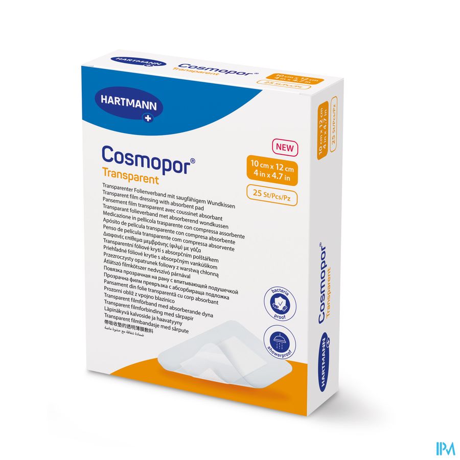 Cosmopor Transparent is een steriel, zelfklevend transparant folieverband met een absorberend wondkussen, gemaakt van een semipermeabele, waterbestendige en transparante polyurethaanfilm gecoat met een polyacrylaat kleeflaag. De semipermeabele polyurethaanfilm is gecoat met een huidvriendelijke kleeflaag.