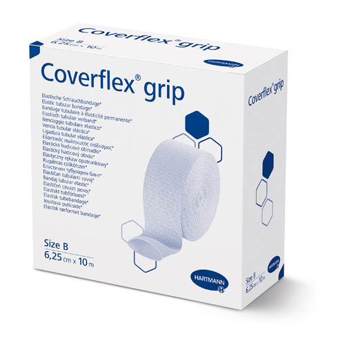 Elastisch buisverband voor fixatie van primair wondverband en voor lichte ondersteuning van gewrichten en ligamenten. Coverflex® grip is geschikt voor gebruik op intacte huid. Het is bedoeld voor secundaire fixatie, als huidbescherming onder gips en als ondersteuning van gewrichten en ligamenten. Het compressie-effect van het product wordt veroorzaakt door het materiaal en het productontwerp, maar het product is niet bedoeld voor compressietherapie. 82% katoen - 9% elastaan - 9% polyamide