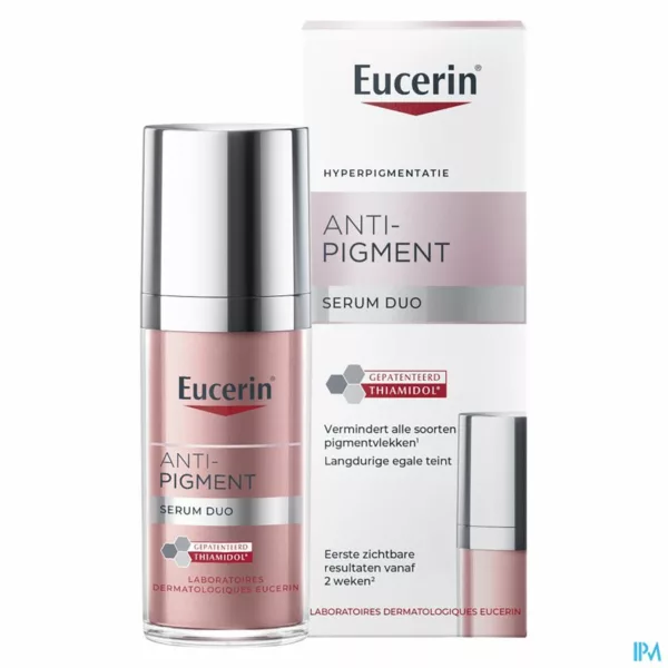 vermindert donkere vlekken helpt vlekken te voorkomen Eucerin Anti-Pigment Serum Duo combineert twee serums die ieder op een verschillende manier werken: een doeltreffend en gepatenteerd ingrediënt dat de oorzaken van hyperpigmentatie bestrijdt. Het is klinisch bewezen dat Thiamidol pigmentvlekken vermindert en bij regelmatig gebruik voorkomt dat ze opnieuw verschijnen.Thiamidol een van de meest doeltreffende vochtinbrengende stoffen van de huid. Helpt de huid vocht aan te trekken en vast te houden.Geconcentreerd hyaluronzuur: