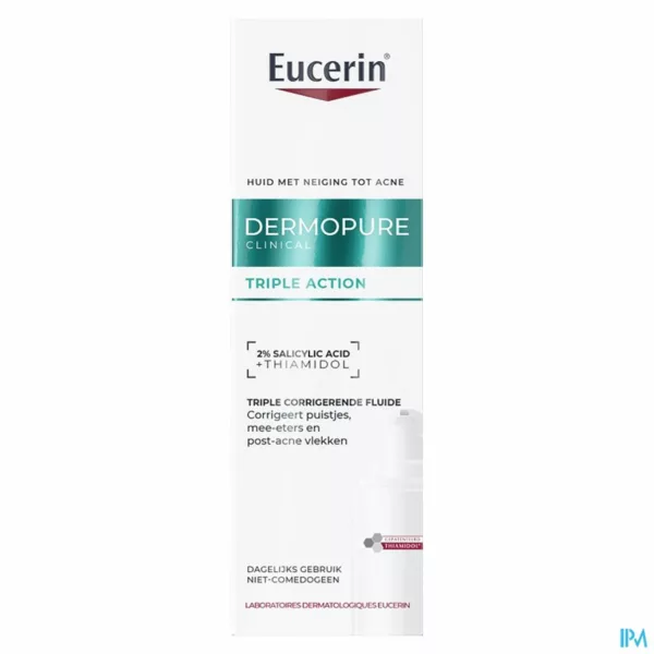 Eucerin DERMOPURE CLINICAL Triple Action Fluid met Salicylzuur, aanbevolen door dermatologen, met klinisch bewezen correctie van de drie hoofdtypes imperfecties: onzuiverheden, post-acne vlekken en mee-eters. Tegelijkertijd gericht op het huidmicrobioom en met de noodzakelijke hydratatie. BELANGRIJKSTE VOORDELEN -80% POST-ACNE VLEKKEN (2) IN COMBINATIE MET DE ZUIVERENDE REINIGER EN EEN DAGCRÈME MET SPF30: -66% PUISTJES (1) -62% MEE-ETERS (1) OVER DE FORMULE: De formule is ontwikkeld voor de vette tot acnegevoelige huid. Deze vetvrije, corrigerende fluid richt zich op specifieke problemen met een lichte textuur. (1) Evaluatie van het aantal letsels door dermatologen bij 658 patiënten, 12 weken gebruik van de routine Dermopure tweemaal per dag. (2) Zelfscore, 43 vrijwilligers, 12 weken gebruik, tweemaal per dag.