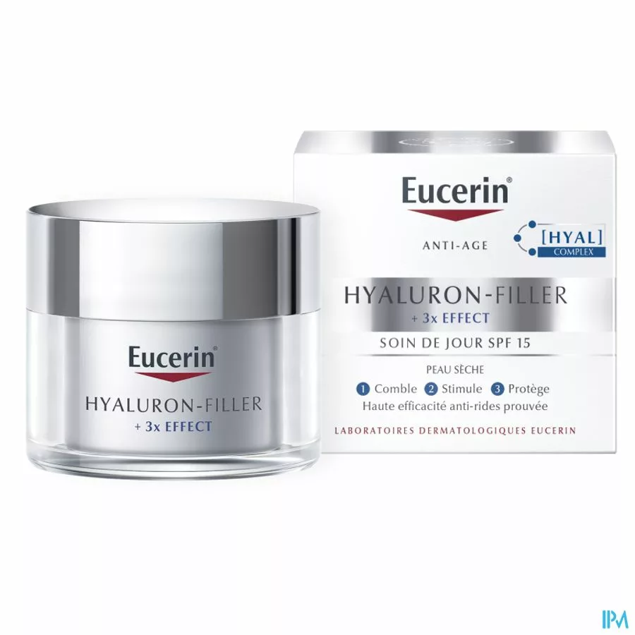 Een geavanceerde antirimpelcrème met hyaluronzuur voor de droge huid die is ontworpen om zelfs de diepste rimpels op te vullen. SPF 15 en UVA-bescherming voorkomen voortijdige veroudering en de verdieping van rimpels. Eucerin Hyaluron-Filler Dagcrème voor de droge huid bevat een unieke combinatie van hyaluronzuur met korte en lange ketens om door te dringen in rimpels en deze van binnenuit op te vullen, evenals bioactief glycine-saponine om de huideigen natuurlijke aanmaak van hyaluronzuur verder te stimuleren, waarbij de huid meer vocht vasthoudt en rimpels van binnenuit glad worden gemaakt. SPF 15 met een UVA-bescherming voorkomen voortijdige veroudering en zelfs diepere rimpels. Creëert een uitstekende basis voor make-up.