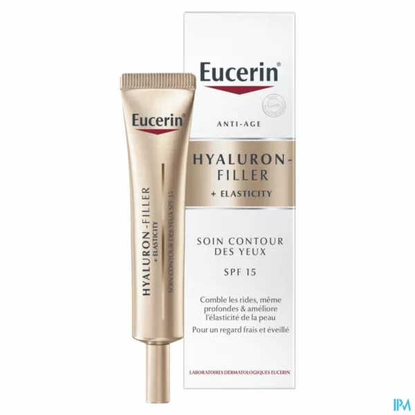 Anti-agingcrème voor de ogen, voor de rijpere huidEucerin Hyaluron-Filler + Elasticity oogcrème SPF 15 is een anti-agingcrème voor de ogen die diepe rimpels zichtbaar vermindert en de elasticiteit van de huid verbetert. De unieke formule biedt meerdere anti-agingvoordelen. De innovatieve mix van Eucerin, met zowel hoog- als laagmoleculair Hyaluronzuur en Arctiin (een actief bestanddeel waarvan is bewezen dat het de vernieuwing van collageen in huidcellen versnelt), vermindert zichtbaar diepe rimpels voor een gladdere, stevigere huid rond de ogen en een stralende, wakkere blik. De oogcrème bevat ook zonbeschermingsfactor 15 en een UVA-filter voor extra bescherming tegen zonnestralen, die rimpels kunnen verdiepen en het verouderingsproces kunnen versnellen. De formule bevat geen parfum, is niet-comedogeen, werd oogheelkundig getest en is geschikt voor gebruik in combinatie met contactlenzen. Klinische en dermatologische studies Klinische en dermatologische studies, waaronder oogheelkundige tests, bewijzen dat het product zeer doeltreffend is en goed verdragen wordt. Belangrijkste bevindingen Naast andere klinische en dermatologische studies, namen 119 vrouwen tussen de 50 en 65 jaar deel aan een gebruiksstudie. Nadat ze het product twee weken lang testten, werden de volgende resultaten gemeld: 99%: de huid ziet er jonger uit 99%: de huid ziet er steviger uit 99%: het voedt de huid 98%: het doet de huid weer stralen 98%: het hydrateert de huid 98%: het vermindert zichtbaar donkere kringen onder de ogen Eigenschappen trekt snel in niet-comedogeen uitstekende basis voor make-up SPF 15 UVA-bescherming zonder parfum geschikt voor gebruik met contactlenzen