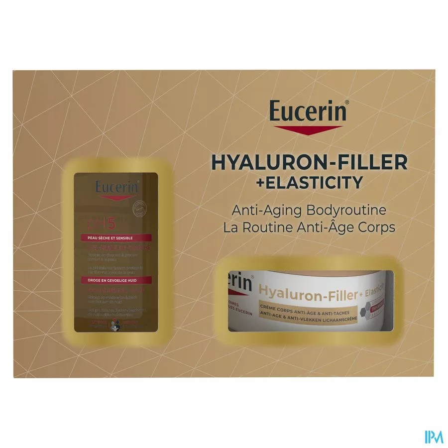 Ontdek het Hyaluron-Filler + Elasticity Lichaamscrème van Eucerin in een limited edition set. Deze set bevat: - Eucerin Hyaluron-Filler + Elasticity Lichaamscrème 200 ml 1. Meer elasticiteit en stevigheid dankzij Arctiine. 2. Meer glans: de gepatenteerde* Thiamidol-formule vermindert de zichtbaarheid van ouderdomsvlekken. 3. Een gehydrateerde, verstevigde huid dankzij Hyaluronzuur *Gepatenteerd Thiamidol (EP 2 758 381 B1) - Eucerin pH5 DoucheOlie 100 ml (cadeau) Ervaar een nieuw gevoel van welzijn. De gevoelige huid heeft een milde reiniging nodig om de weerstand van de huid tegen dagelijkse invloeden van buitenaf te weerstaan.