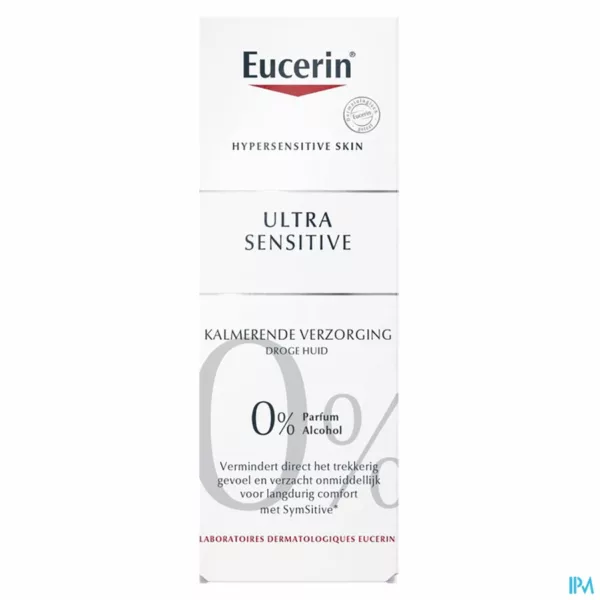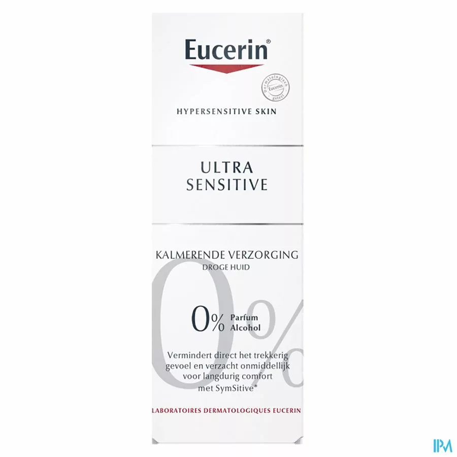 Eucerin UltraSENSITIVE Kalmerende Crème Droge huid wordt aanbevolen voor de overgevoelige huid waar het belangrijkste symptoom een onaangename huid is met een brandend, stekend gevoel of jeuk, maar zonder zichtbare tekenen van roodheid. Aangebracht na reiniging, kalmeert het direct en verzacht het de droge, overgevoelige huid van het gezicht, de hals en het decolleté en geeft langdurig comfort en bescherming aan de huid, terwijl speciale ingrediënten in de crème de huid verzachten en hydrateren.