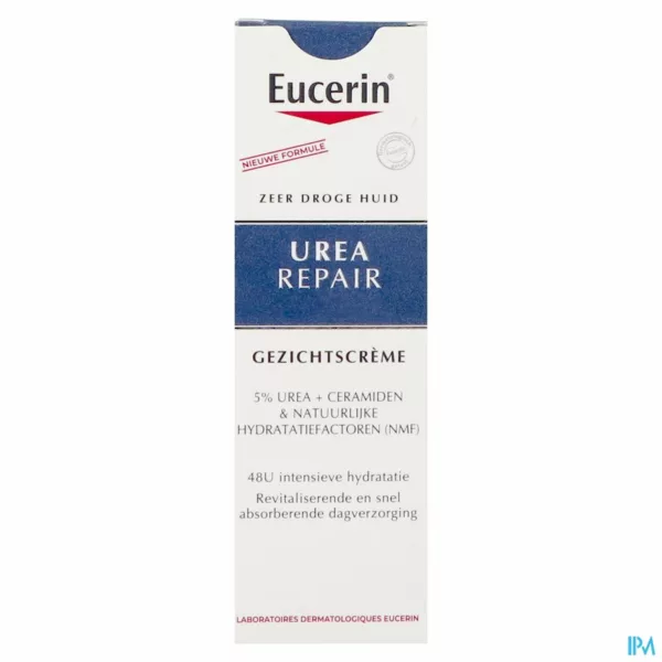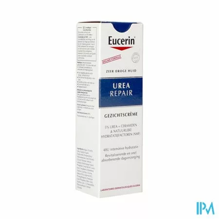 Eucerin UreaRepair Gezichtscrème 5% Urea De UreaRepair Gezichtscrème 5% Urea is een milde, snel intrekkende, hydraterende crème voor dagelijks gebruik die is ontwikkeld voor de droge tot zeer droge huid met een trekkerig gevoel. Deze crème bevat Urea en Lactaat, twee stoffen die van nature aanwezig zijn in de huid en die vocht vasthouden. Dit product hydrateert onmiddellijk de gezichtshuid, vermindert een trekkerig gevoel en laat de huid zacht en soepel aanvoelen. De Eucerin UreaRepair Gezichtscrème 5% Urea vermindert ruwheid door de huid gehydrateerd te houden. Dit product is ideaal als basis voor make-up of voor na het scheren.