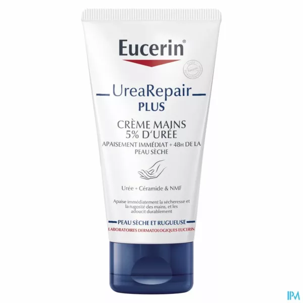 De Eucerin UreaRepair 5% Urea Handcrème geeft de droge en ruwe huid van de handen de dagelijkse verzorging die ze nodig hebben. De crème bevat een specifieke combinatie van ingrediënten: 5% Urea, Ceramiden en andere Natuurlijke Hydratatiefactoren (NMF's, Natural Moisturizing Factors), die vocht binden en helpen de natuurlijke beschermende barrière van de huid te versterken om haar te beschermen tegen meer vochtverlies. Het is klinisch en dermatologisch bewezen dat deze formule onmiddellijk verlichting geeft en langdurige, intensieve hydratatie van de droge, ruwe huid van de handen, zelfs na herhaaldelijk wassen. De hydraterende crème voor de handen versterkt de natuurlijke barrière van de huid en maakt de huid beter bestand tegen droogheid gedurende tot 48 uur*. De hydraterende crème met Urea is geschikt voor alle types droge handen, ook voor de rijpe huid en de huid met neiging tot huidaandoeningen, zoals xerose en psoriasis, en voor de huid van mensen met diabetes. De crème kan ook worden gebruikt als cosmetische verzorging tegelijkertijd met een medische behandeling (raadpleeg een arts voor gebruik in combinatie met lokale geneesmiddelen). *Instrumentele evaluatie, 30 vrijwilligers