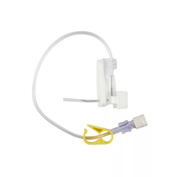 Grippernaald voor het aanprikken van de port-a-cath. 90graden gebogen - RVS - fixatieplaatje - met leiding