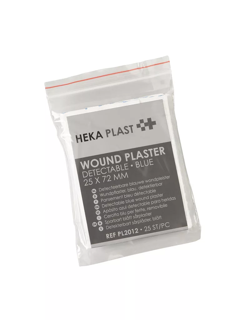 De Heka plast detectable met aluminium strips onder het wondkussen zijn makkelijk detecteerbare wondpleisters. Het dragermateriaal is PE. Door het niet-verklevende wondkussen kleeft deze niet aan de wond en laat het zich pijnloos verwijderen.