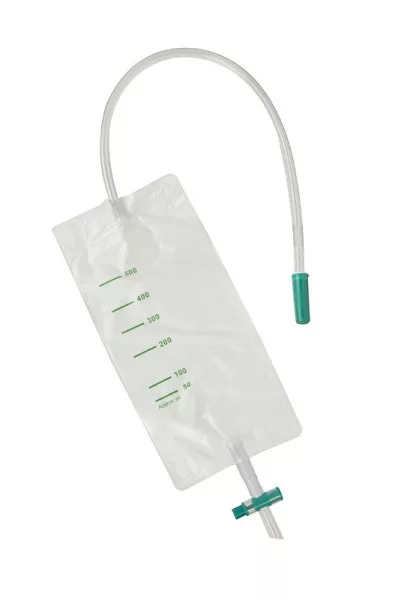 Dagzak/beenzak met kruiskraan voor eenmalig gebruik. Voorzien van een schuine inlaat en een terugslagventiel. Maatverdeling indicatief weergegeven.