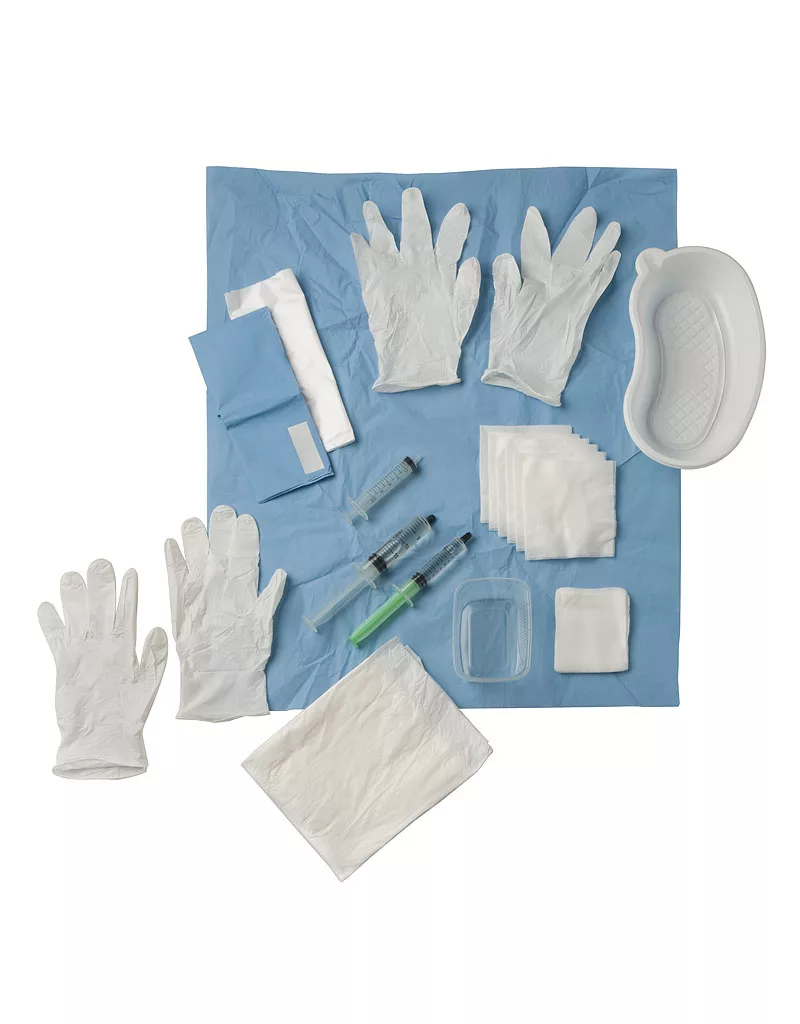 Blaaskatherisatieset: 1 nierbekkenschaal, kunststof wit 1 steriel veld 50 x 60 cm met PE laag, gevouwen om de set 1 absorberende onderlegger 40 x 60 cm 1 splitgatdoek 50 x 60 cm met PE laag voorzien van 4 plakstrips 1 bakje 250 ml, transparant 1 afvalzakje met plakstrip 32 x 20 cm 1 spuit 10 ml leeg 1 spuit 10 ml Lubricating Jelly 2 spuiten 10 ml aqua dest, steriel water 2 paar nitrile handschoenen in foedraal, maat L 2 gaaskompressen 7 x 9 cm, 8 laags 6 gaasjes 10 x 10 cm, 4 laags