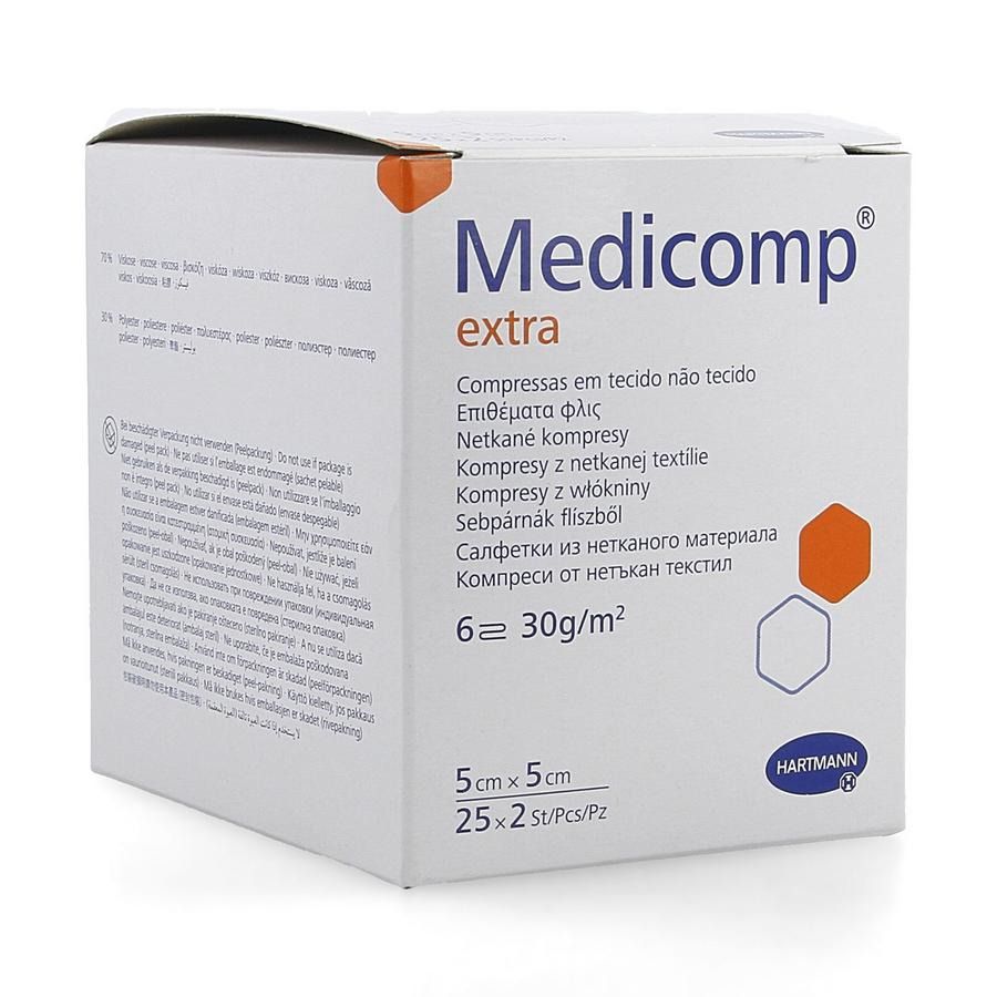 Non-woven kompres met gaasstructuur van 70% viscose en 30% polyestervezels; vrij van bindmiddelen en optische witmakers; zeer absorberend, zacht en luchtdoorlatend; beschikbaar in verschillende lagen. Voor de algemene wondverzorging; als depper en als kompres bij kleine operatieve ingrepen; Medicomp Drain is specifiek ontworpen voor de wondverzorging bij drainage, tracheotomie en extensies en zelfs als bescherming bij gebruik van canules en sondes.