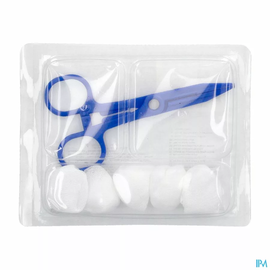 Mondverzorgingsset in harde blister, 3 compartimenten:- Blister kan als tray gebruikt worden. - Compartimenten voor ontsmettingsmiddel of vloeistof. Inhoud: 1 Kocher klem polyamide 14 cm blauw 5 gaasdeppers formaat pruim