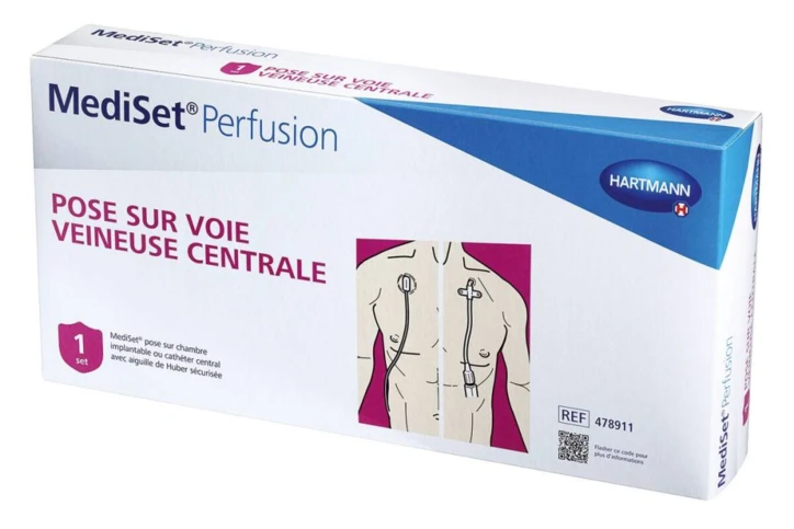 Steriele set voor eenmalig gebruik, samengesteld uit medische hulpmiddelen die nodig zijn voor de thuisplaatsing van een perfusie op een implanteerbare kamer of centraal katheter met beveiligde Huber-naald (20G).