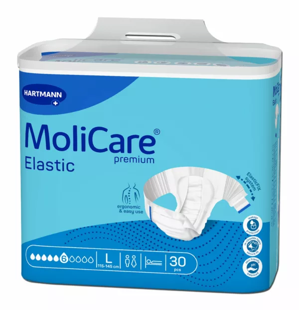 MoliCare Premium Slip. Alles-in-één incontinentieslip die een veilige bescherming biedt en tegelijkertijd de huid gezond houdt. Incontinentieslips met zachte textielachtige buitenzijde, discreet, wit, voor een hoog draagcomfort; ademend non-woven zijwaarts ter hoogte van de heupen en een antibacteriële pH-neutrale verdeellaag, geurbindende 3-lagige absorptiekern en vochtindicator die het ideale tijdstip van de luierwissel helpt bepalen; vochtafstotende anatomisch gevormde en gebogen antilekrandjes, anatomische pasvorm met elastische beenafsluiting in het kruis; meermaals hersluitbare klittenband-kleefstrips; veilige bescherming tegen lekken en terugvloei, zorgt voor een aangename en droge huid; dermatologisch getest. Bij matige urine- en/of stoelgangincontinentie voor zeer hulpbehoevende of onrustige patiënten; voor een gezonde huid ondanks incontinentie.