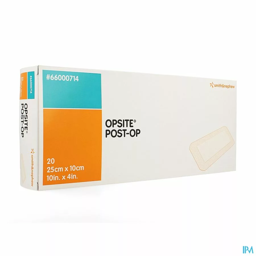 Opsite Post-Op is een uniek, steriel, waterdicht, ademend, transparant, post-operatief verband dat de voordelen combineert van een hoge vochtdoorlaatbare folie met een niet verklevend sterk absorberend wondkussen. Het is uiterst geschikt voor post-operatieve en dagelijkse kleine wonden zoals snij- en schaafwonden, gehechte wonden en scheurwonden.Het soepele en aanpasbare verband is afwasbaar en heeft afgeronde hoeken