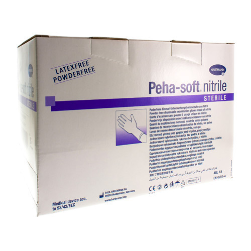Latexvrije, steriele disposable onderzoeks-en beschermingshandschoen van zacht, blauw nitrilrubber, poedervrij;gechloreerde binnenlaag voor makkelijk aantrekken; getextureerde vingertoppen voor optimale grip; zeer elastisch en bijzonder scheurbestendig; perfecte pasvorm en uitstekend tastgevoel; per paar verpakt. Duurzame medische handschoenen voor eenmalig gebruik in alle domeinen waar er risico op contaminatie voor het personeel is. In het bijzonder geschikt voor personen die overgevoelig zijn voor handschoenpoeder of allergisch zijn voor latex proteïnen (Type-I-allergie).