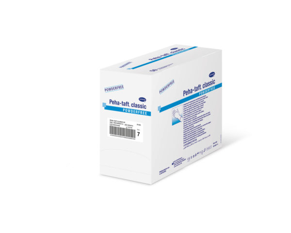 Poedervrije operatiehandschoenen voor eenmalig gebruik van dun, bijzonder zacht latex, transaparant voor meer veiligheid. Peha-taft classic poedervrij is geschikt voor alle chirurgische ingrepen en de anatomische pasvorm voorkomt vermoeidheids-verschijnselen. Gemakkelijk aan te trekken door de polymeerbekleding aan de binnenzijde en een speciaal getextureerd oppervlak voor een uitstekend tastgevoel en een optimale veilige grip; zeer elastisch en scheurvast voor een zeer goede bescherming. Peha-taft classic powderfree is een medisch product dat voldoet aan Europese Norm EN 455 en een persoonlijk beschermingmiddel conform EN 374. Geschikt voor gebruik met cytostatica en chemicaliën. Geadviseerd als buitenste handschoen in combinatie met Peha-underglove latex. Bereikt een AQL niveau van 0,65.