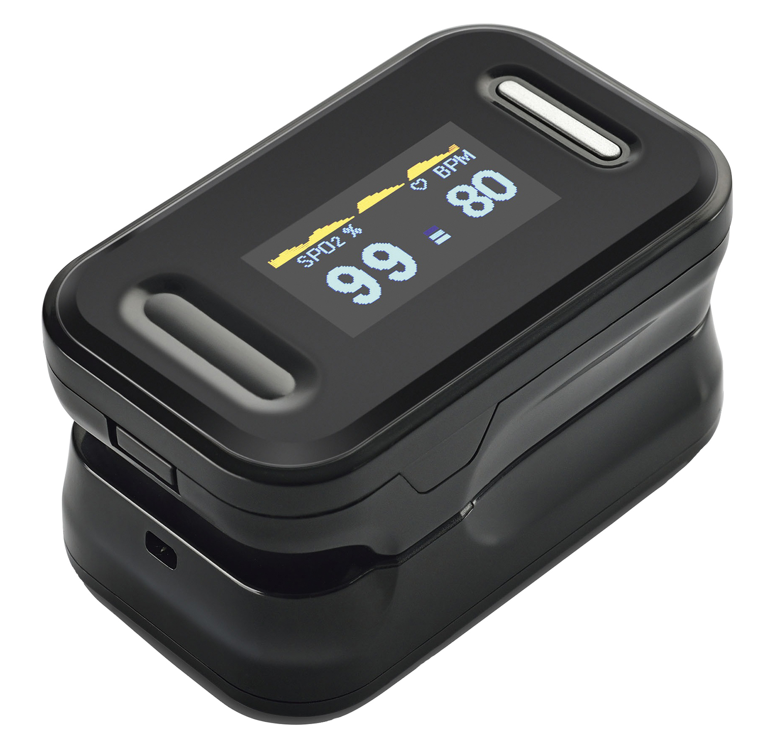 Tweekleurige OLED-display met Sp02-percentage, hartslag en hartslaggrafiek.