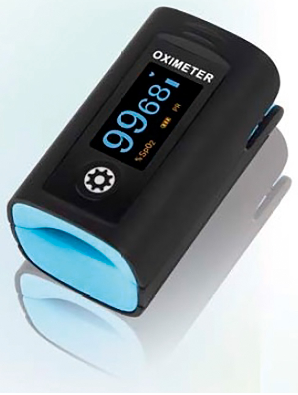 Tweekleurig LED-display met weergave van SpO2-percentage, hartslag, perfusie-index, puls-staafgrafiek, plethysmogram.