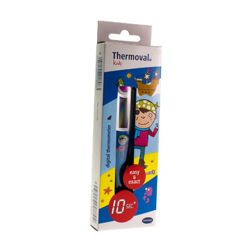De thermometer is uitgerust met een harde meetpunt, een extra groot LCD display, een start-/stopknop, een afneembaar batterijdeksel en is in een transparant beschermetui verpakt. Het display toont de gemeten temperatuur in °C , de status van de batterijen, er is een geluidsignaal, een automatische start/stop functie en een geheugenfunctie met de laatst gemeten waarde. De thermometer werkt met een batterij van lange levensduur en is waterdicht. Thermoval kids® meet sneller dan de bestaande standaard digitale elektronische thermometers (*).
