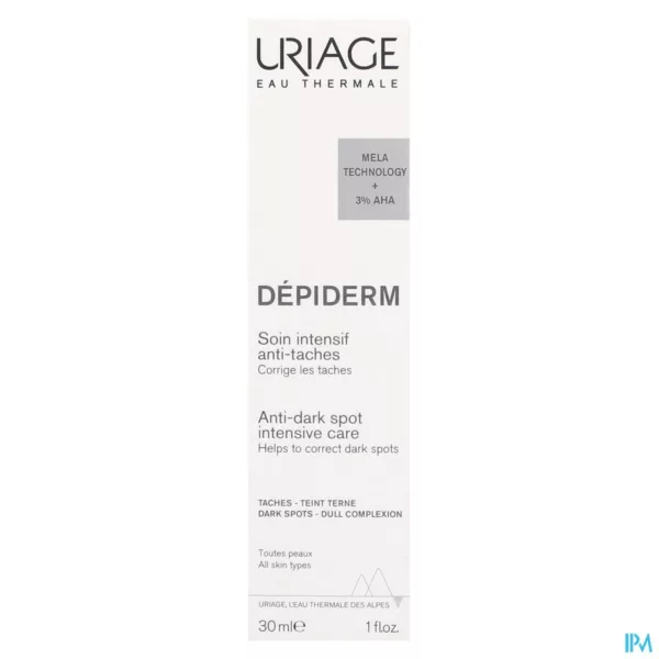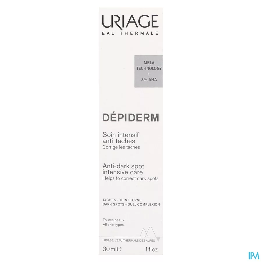 DÉPIDERM INNOVATIE Deze Intensieve verzorging tegen vlekken corrigeert vlekken, verfijnt de huidtextuur en egaliseert de teint. EFFECT OP VLEKKEN Dermatologische werkzame stoffen: [Mela Technology + Vitamine C + AHA + Niacinamide] Voor een volledige correctie en preventie van vlekken werd de basisformule met MELA TECHNOLOGY* in deze verzorging gecombineerd met ingrediënten van 100% natuurlijke oorsprong, VITAMINE C, AHA's en NIACINAMIDE. *ERWTENEXTRACT EN SUCROSE + THERMAAL WATER VAN URIAGE + ENOXOLON UITSTEKEND VERDRAGEN De ongeparfumeerde, niet-comedogene en dermatologisch geteste formule van deze verzorging is geschikt voor alle huidtypes, ook gevoelige.
