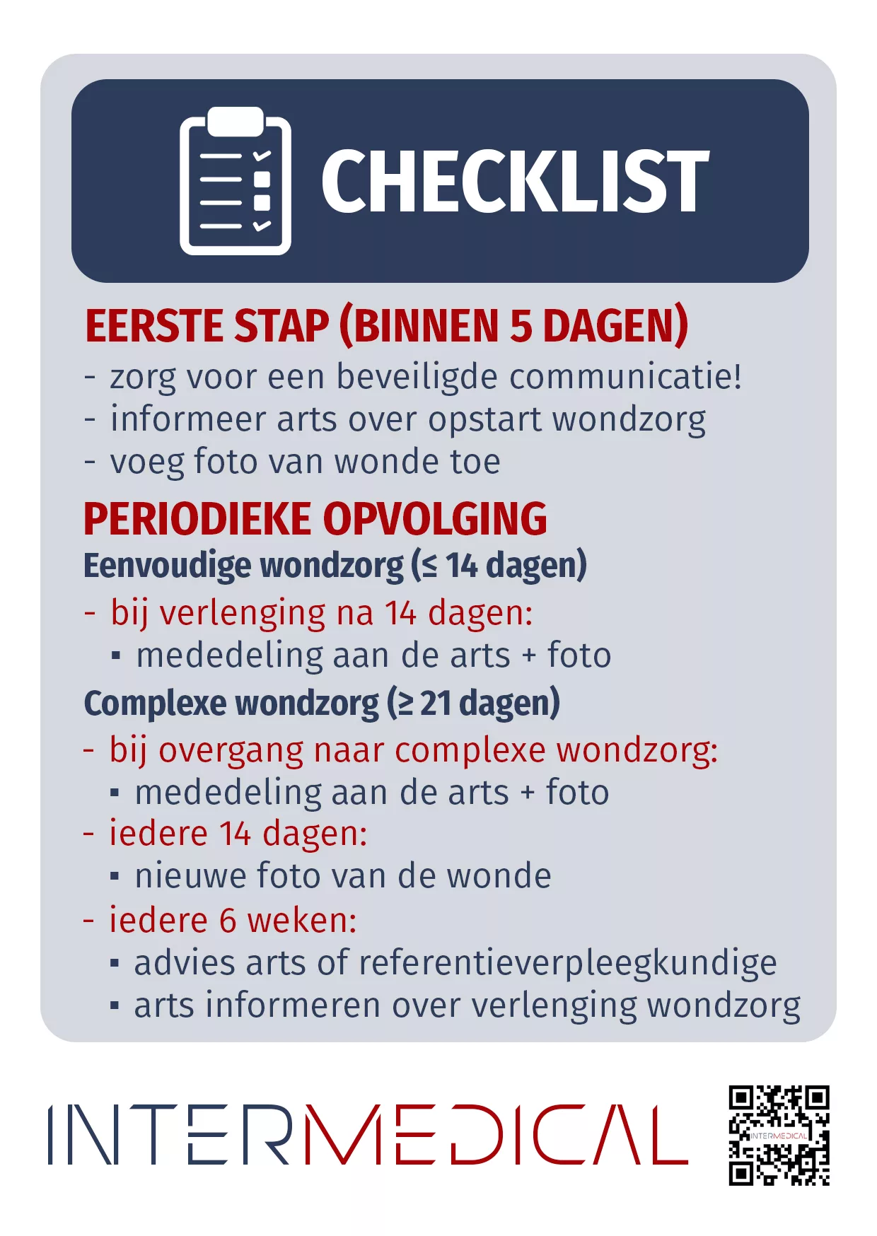 Praktisch kaartje dat de verschillende stappen in de communicatie rond wondzorg handig samenvat. Sla op bij je foto's op je gsm, of print het uit en geef het een vaste plaats in je verpleegtas!